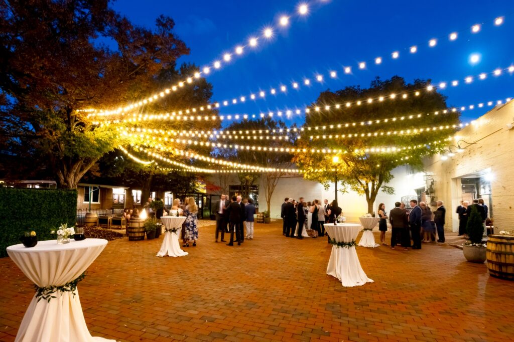 The Grove at City Market is a distinctive wedding venue located in the heart of downtown Raleigh’s historic City Market district. Blending timeless charm with modern sophistication, The Grove offers couples a one-of-a-kind setting featuring exposed brick walls, warm wood accents, and elegant lighting that together create a romantic and inviting atmosphere. The venue includes multiple flexible event spaces—ideal for both intimate ceremonies and lively receptions. Couples can exchange vows in the picturesque outdoor courtyard surrounded by market lights and greenery, then move inside to celebrate in one of the beautifully restored indoor rooms, such as The Oak Room or The Willow Room. The connected speakeasy-style bar and lounge adds a touch of vintage flair and provides a relaxed space for cocktails and conversation. With accommodations for up to around 100 seated guests or 150 for a cocktail-style reception, The Grove is perfect for couples seeking a personal, boutique-style experience. The venue also offers in-house catering and bar services, ensuring every detail is handled seamlessly. Conveniently situated within walking distance of Raleigh’s downtown hotels, restaurants, and nightlife, The Grove at City Market captures the essence of urban romance—making it one of Raleigh’s most unique and memorable wedding venues.